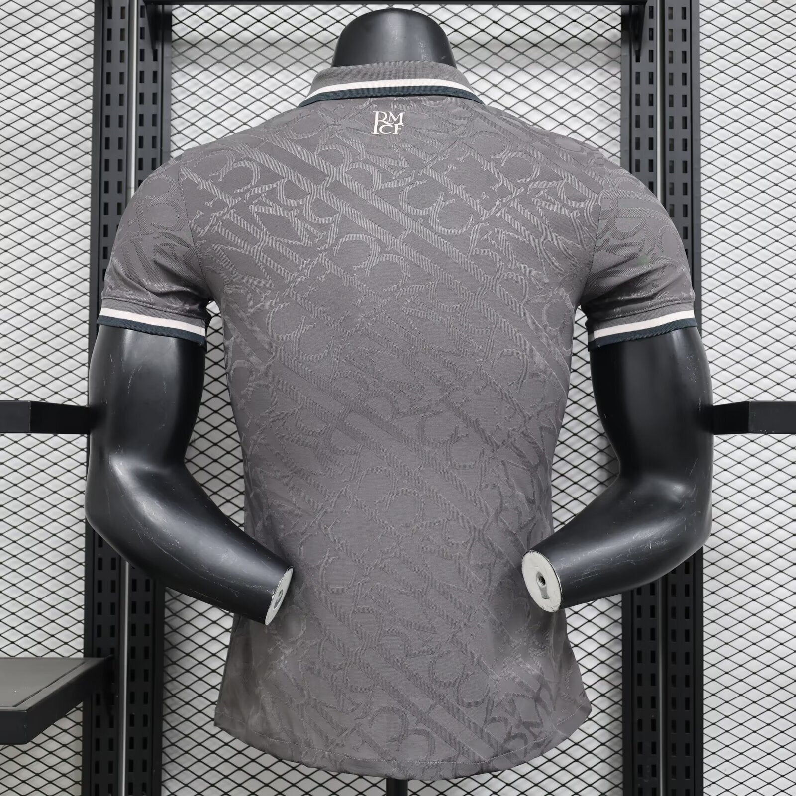 Tiene un color principal gris parduzco, combinado con el estampado 'RMCF' por toda la camiseta, como resultado es una de las camisetas más lindas, ¡Añádela a tu colección y demuestra tu pasión por el equipo merengue con esta opción única!