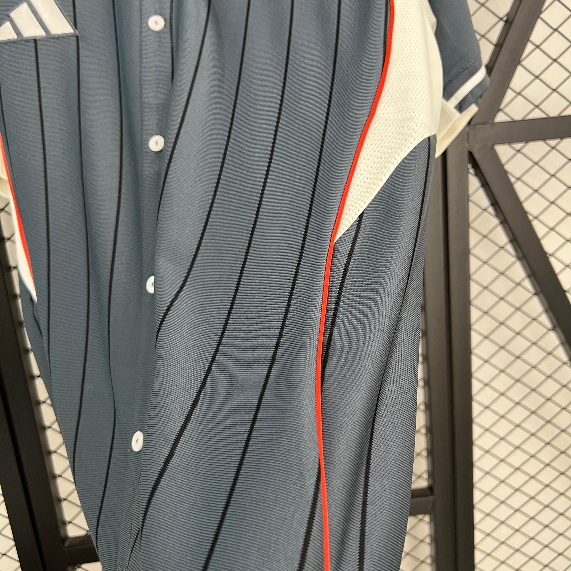 La camiseta beisbolera de presentación del Bayern Múnich 2025/2026 combina elegancia y modernidad con un diseño gris oscuro de finas líneas verticales, acentuado por las icónicas tres franjas rojas en los hombros. Con el escudo del club en blanco y detalles en crema que realzan su estilo, esta prenda fusiona la tradición del gigante bávaro con un look urbano y sofisticado.